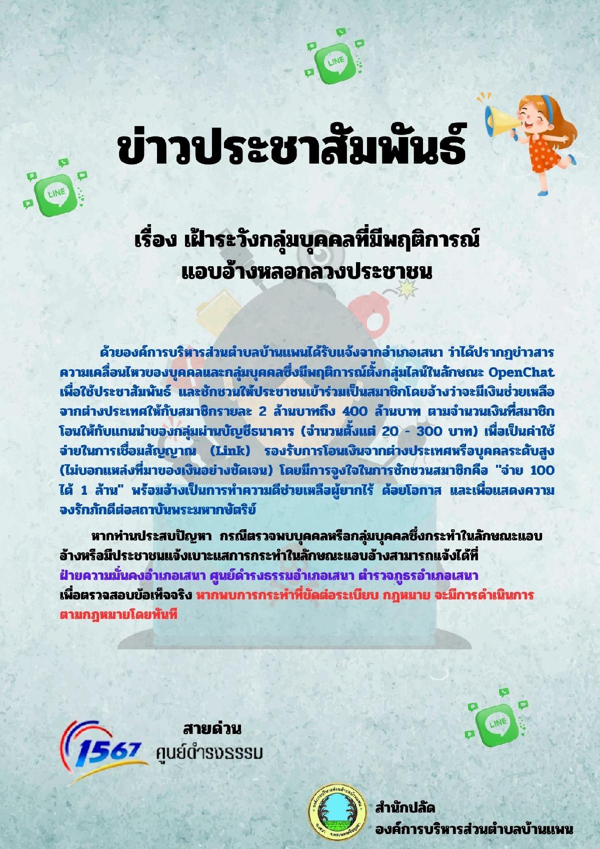 | ประชาสัมพันธ์ เรื่องเฝ้าระวังกลุ่มบุคคลที่มีพฤติการณ์แอบอ้างหลอกลวงประชาชน |