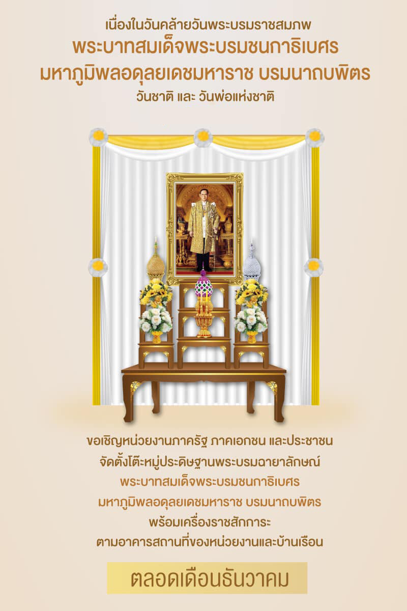 ขอเชิญประชาชนจัดตั้งโต๊ะหมู่ประดิษฐานพระบรมฉายาลักษณ์ พระบาทสมเด็จพระบรมชนกาธิเบศร มหาภูมิพลอดุลยเดชมหาราช บรมนาถบพิตร พร้อมเครื่องราชสักการะ เครื่องทองน้อย ตามอาคารสถานที่ของหน่วยงานและบ้านเรือน ตลอดเดือนธันวาคม 2567